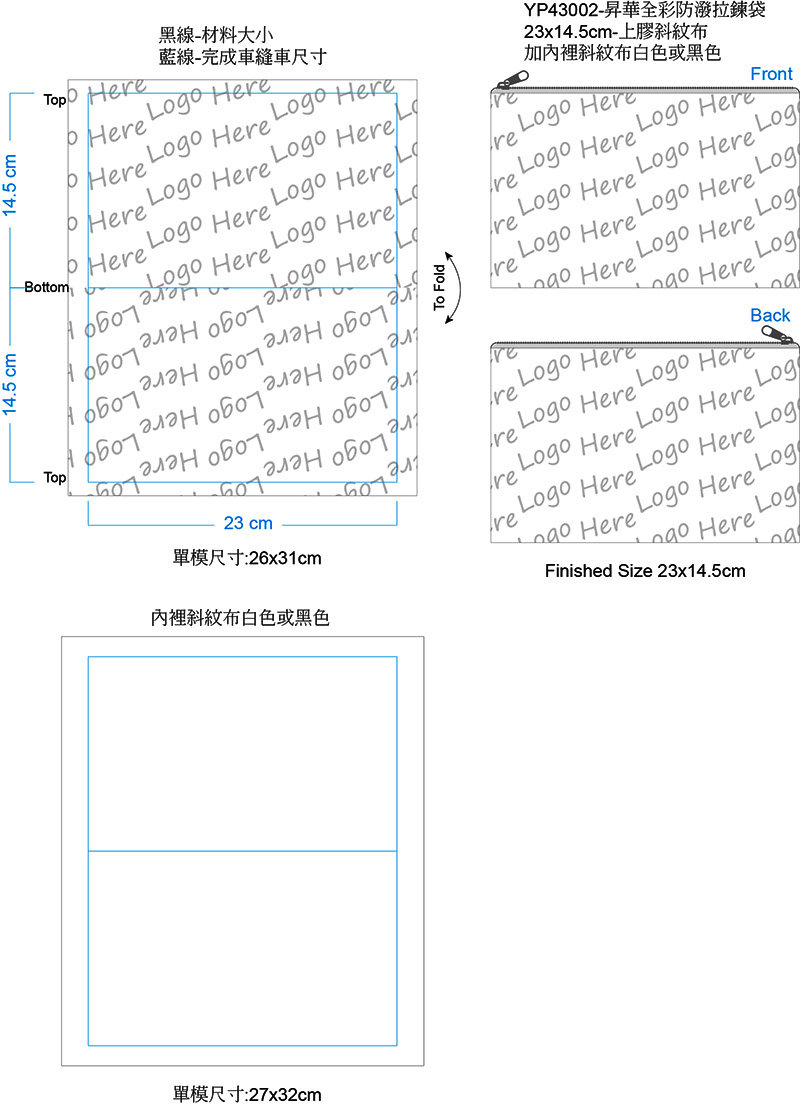 Double-layer large zipper pouch is 100% Made in Taiwan in-house YesPromotion. The Water Repellent Polyester gives better protection from weather and is ideal to have CMYK sublimated. Zipper closure on top default in black.